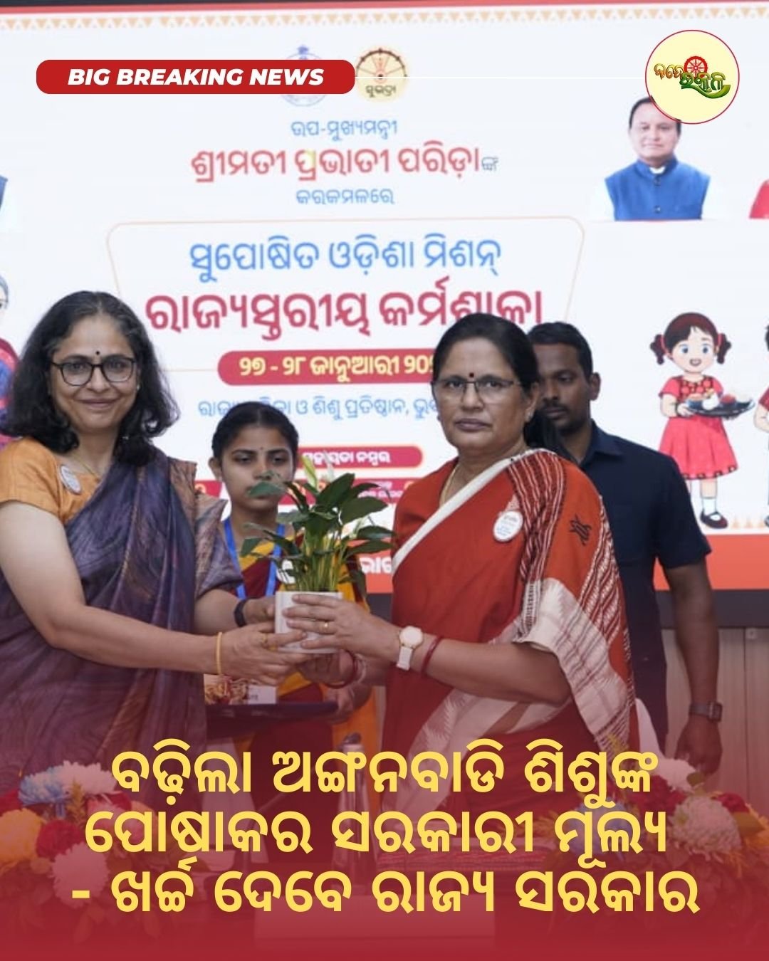 ମାଳତୀ ଦେବୀ ପ୍ରାକ୍ ବିଦ୍ୟାଳୟ ଯୋଜନା ଅଧୀନରେ ଅଙ୍ଗନବାଡ଼ି କେନ୍ଦ୍ରରେ ନାମଲେଖାଇଥିବା ୩ ରୁ ୬ ବର୍ଷ ବୟସର ଶିଶୁମାନଙ୍କୁ ପ୍ରଦାନ କରାଯାଉଥିବା ୟୁନିଫର୍ମ, ଜୋତା, ମୋଜା ଓ ସ୍ୱେଟରର ମୂଲ୍ୟ ସଂଶୋଧନ ପାଇଁ ଓଡ଼ିଶା ସରକାର ଅନୁମୋଦନ ଦେଇଛନ୍ତି।