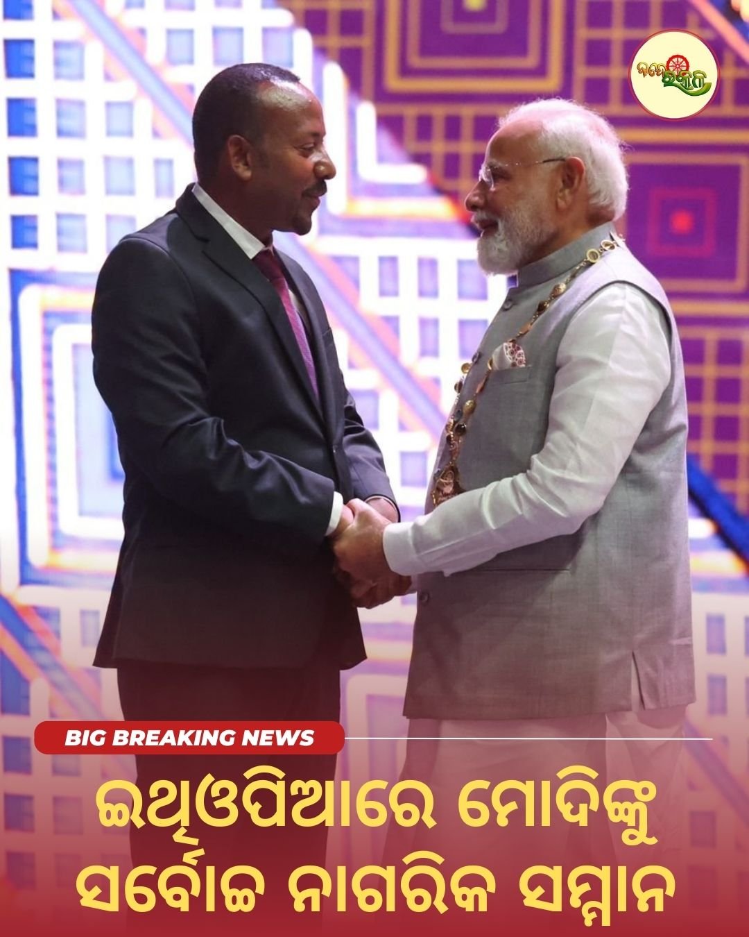 ଇଥିଓପିଆର ସର୍ବୋଚ୍ଚ ନାଗରିକ ସମ୍ମାନରେ ସମ୍ମାନିତ ହେଲେ ଦେଶର ପ୍ରଧାନମନ୍ତ୍ରୀ ଶ୍ରୀଯୁକ୍ତ ନରେନ୍ଦ୍ର ମୋଦି । ଇଥିଓପିଆର ମହାନ ସମ୍ମାନ ନିଶାନ ଗ୍ରହଣ କରିଛନ୍ତି ପ୍ରଧାନମନ୍ତ୍ରୀ ମୋଦି । ଦ ଗ୍ରେଟ ଅନର ନିଶାନ