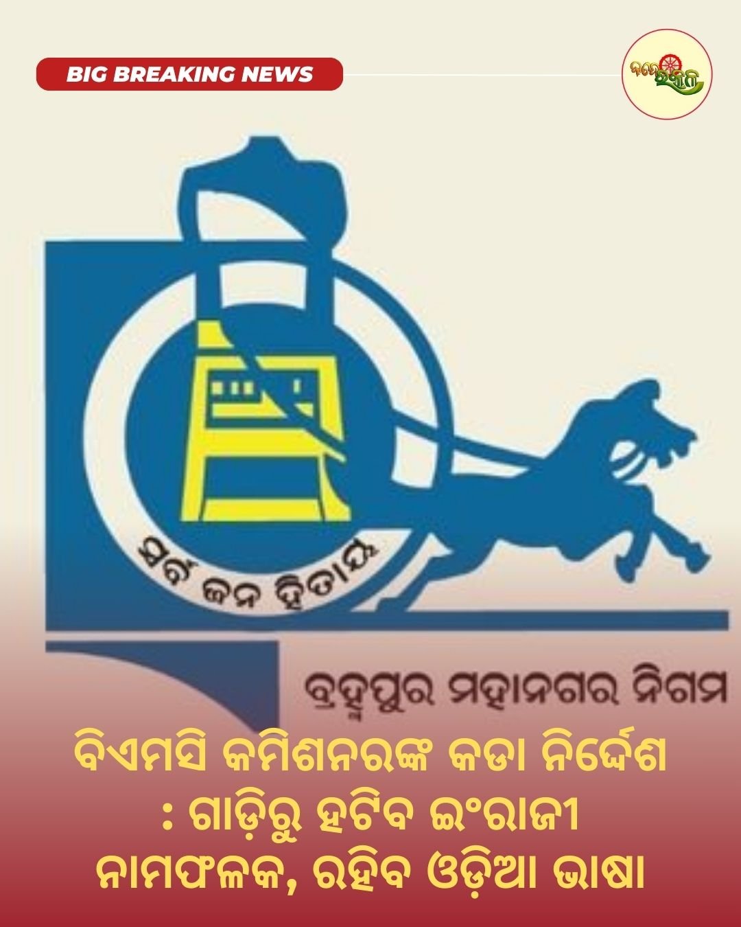 ବ୍ରହ୍ମପୁର : ଏଣିକି ସରକାରୀ ଅଧିକାରୀମାନଙ୍କ ବ୍ୟବହୃତ ଗାଡ଼ିରୁ ହଟିବ ଇଂରାଜୀ ନାମଫଳକ । ସମସ୍ତ ନାମଫଳକ କେବଳ ଓଡ଼ିଆ ଭାଷାରେ ଲେଖାଯିବ। ଏନେଇ ବ୍ରହ୍ମପୁର ମହାନଗର ନିଗମ (ବିଏମସି) କମିଶନର ଶ୍ରୀଯୁକ୍ତ ଅରବିନ୍ଦ